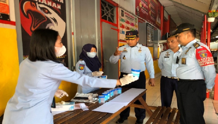Disaksikan Karutan, Ridwan Susilo, sebanyak 12 orang petugas termasuk pejabat struktural, staf, komandan hingga anggota rupam melakukan Tes Urine dadakan.