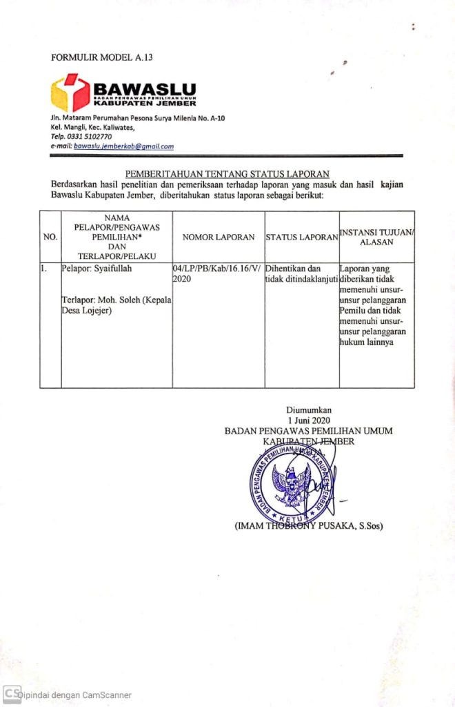 Setelah dua kali mangkir saat dimintai keterangan oleh Bawaslu Jember terkait dugaan penyalahgunaan wewenang Jabatan yang mengarah pada indikasi politik oleh Bupati Faida, akhirmya pihak Bawaslu “menyerah” dengan mengeluarkan surat pemberhentian penanganan kasus tersebut tertanggal 1 juni 2020.