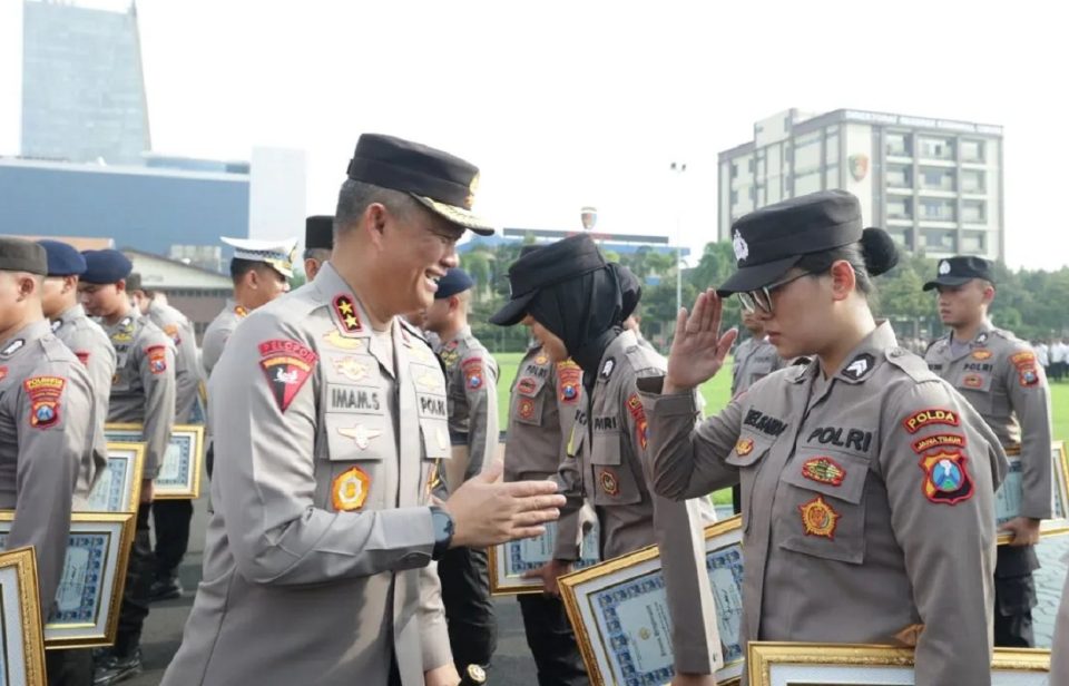 Kapolda Jawa Timur Inspektur Jenderal Polisi Imam Sugianto memberikan penghargaan kepada personel dan Pegawai Negeri Sipil (PNS) berprestasi. Senin, (8/1/2024)