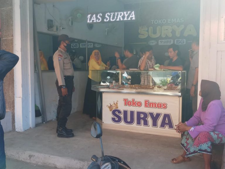 Bripka Imam Munandar, sejak pagi hari personil Polsek Pakong sudah berada dilokasi pertokoan untuk memantau dan mengamankan seluruh aktivitas di pasar Polowijo tak terkecuali toko emas yang kerap menjadi favorit kaum ibu ibu yang bertransaksi jual beli perhiasan emas, Senin (22/06/2020).