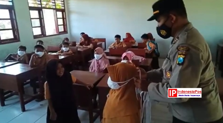 Kapolsek Palengaan IPTU Sri Sugiarto dibantu Kanit Binmas membagikan masker kepada siswa siswi SD Negeri Rekkerek 2, KecamatanPalengaan Kabupaten Pamekasan. Sabtu, (05/06/2021).