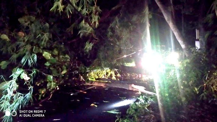 Sebuah pohon sengon besar tumbang, hingga melintasi jalan, didepan SMA Pujer, Kabupaten Bondowoso. Minggu (28/02/2021) malam. Akibat angin kecang dan hujan. Sekira pukul 20.30 WIB>