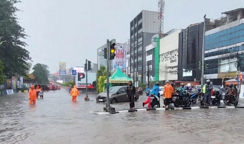 Kini sejumlah petugas Sudin SDA tengah berjibaku menyurutkan banjir di Jalan Gandaria City.