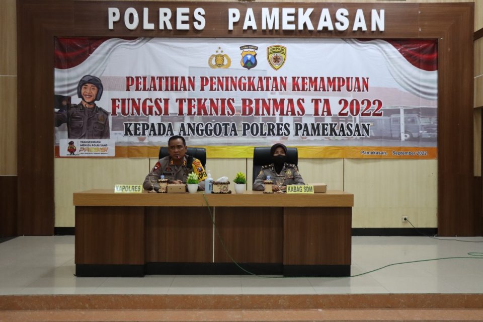 PAMEKASAN,IndonesiaPos – Kapolres Pamekasan AKBP Rogib Triyanto didampingi Kabag SDM Polres Pamekasan Kompol Hj. Maryatun dan Kasat Binmas Polres Pamekasan AKP Bambang Irawan, membuka pelatihan bagi anggota binmas di gedung bhayangkara, Rabu (28/9/2022).