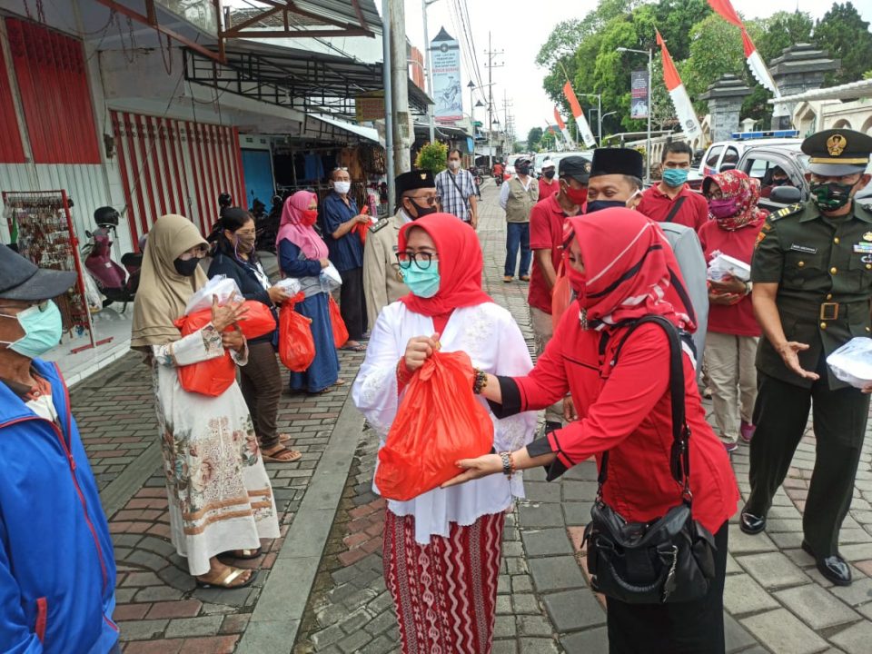 Dia didampingi Kader PDIP mulai Walikota Blitar Santoso dan Ketua DPRD Kota Blitar dr Syahrul Alim, membagi bagikan bantuan paket sembako, nasi kotak, masker dan hand sanitizer pada pedagang Makam Bung Karno.