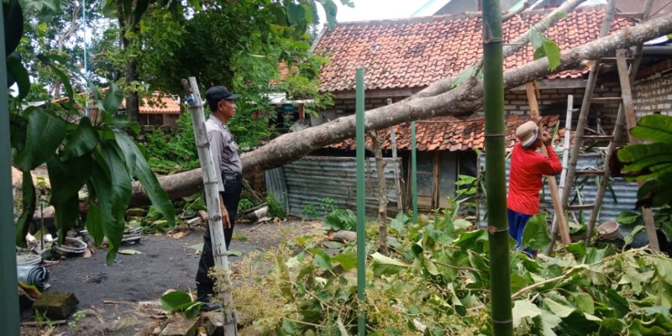 “Pohon jati yang berada di samping rumah ibu Rafi’ah (57) roboh mengenai atap rumah ibu Rafi’ah, akibat angin puting beliunng,”tutur Kapolsek Pademawu.
