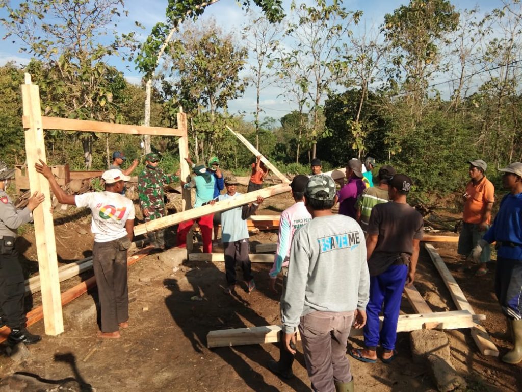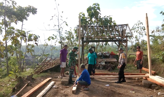 Pejabat Semenetara (P) Kanit Binmas Polsek Tapen Bripka Mamik Santoso bersama Babinsa juga di bantu warga dusun Salak desa Taal kecamatan Tapen membedah rumah tidak layak huni milik Sumini warga setempat. Selasa (02/06/2020) sekira pukul 08.00 WIB.