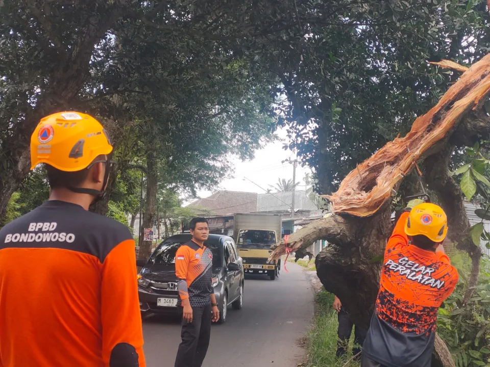 Petugas BPBD Bondowoso menjelaskan pohon besar berdiameter 40 sentimeter tersebut tumbang karena keropos dan angin kencang yang melanda Bondowoso beberapa hari terakhir.