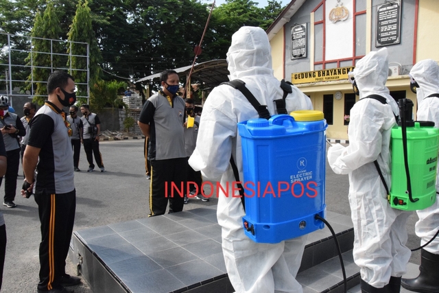 Untuk mencegah dan mengantisipasi penyebaran virus corona, asrama Polisi dan ruang kerja anggota Polres Pemekasan disemprot dengan cairan disoinfektan, sebagai upaya memutus mata rantai Covid-19, Sabtu (19/09/2020).