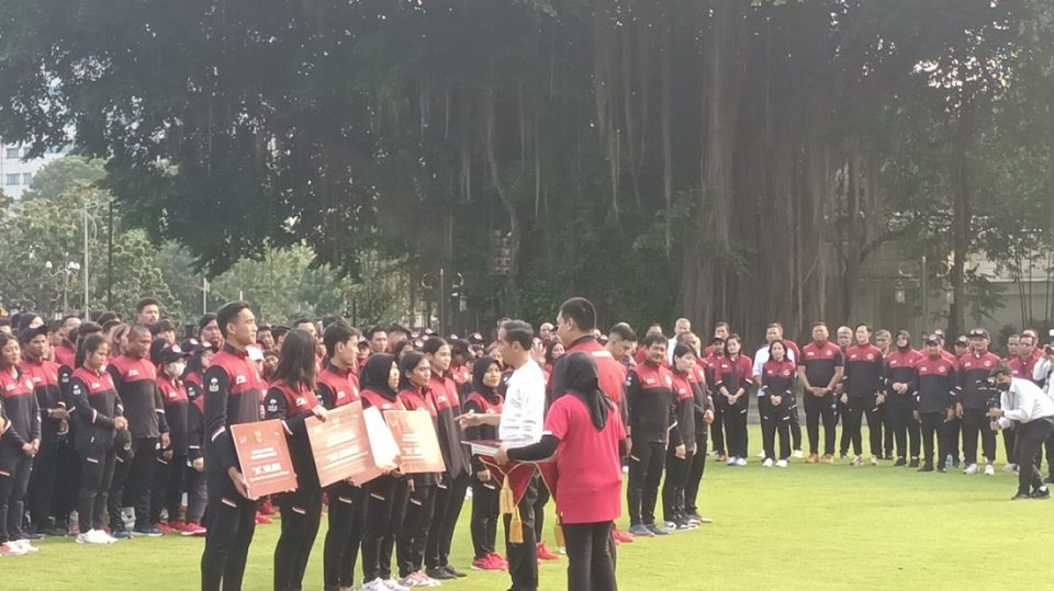 Dalam kesempatan ini, Jokowi memberikan bonus secara simbolis kepada para atlet maupun tim oficial yang telah berjuang di SEA Games Kamboja 2023.