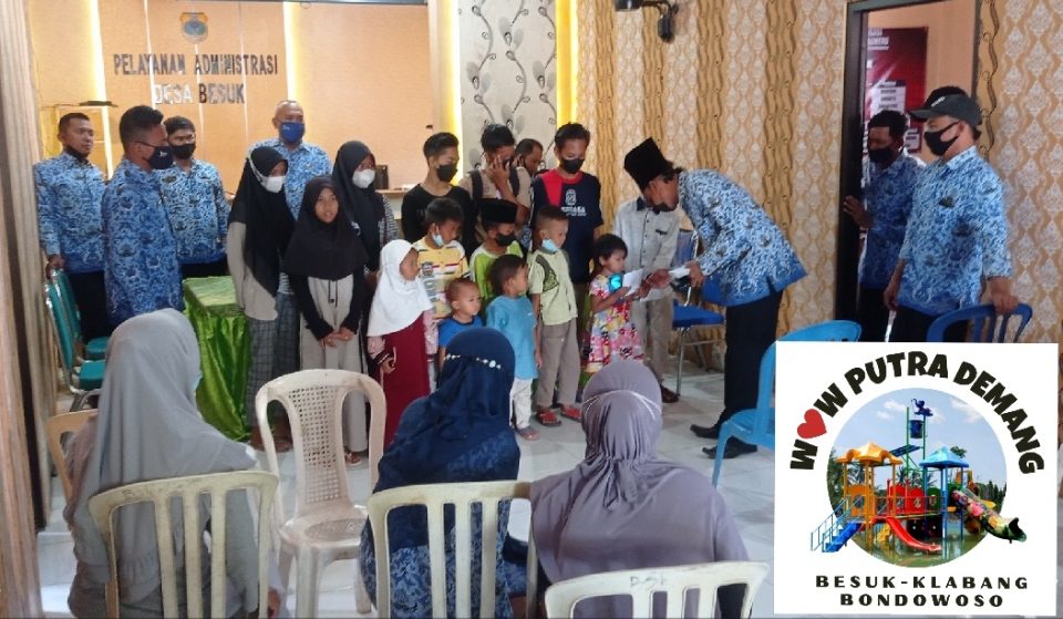 Kepala Desa Besuk Kecamatan Klabang Kabupaten Bondowoso Sugiarto untuk ke 3 kali periode, mengumpulkan anak yatim sebanyak 17 orang di Kantor Desa Besuk. Mereka di berikan santunan berupa uang tunai. Jum’at (17/12/2021).