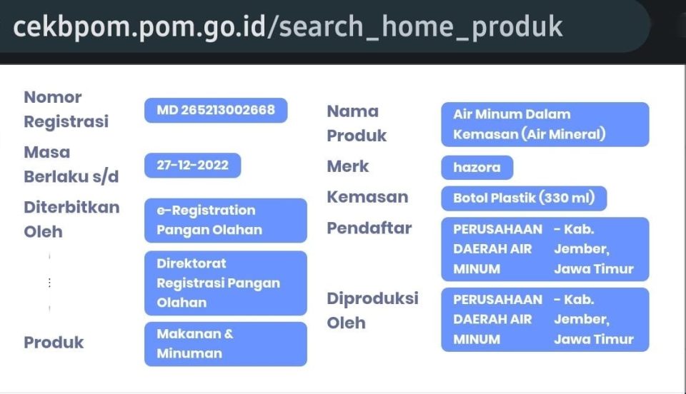 Dari pantauan media di laman situs milik Badan Pengawas Obat dan Makanan (BPOM) RI menyebutkan bahwa air minum dalam kemasan botol plastik merek Hazora masa berlakunya sudah habis sejak (27/12/2022) lalu.