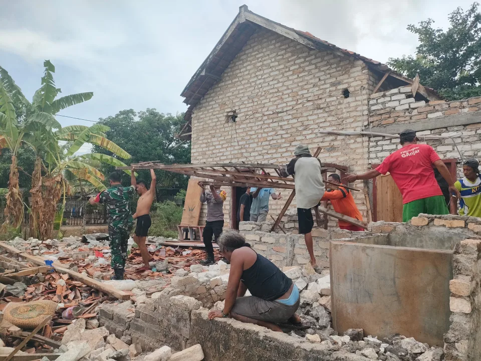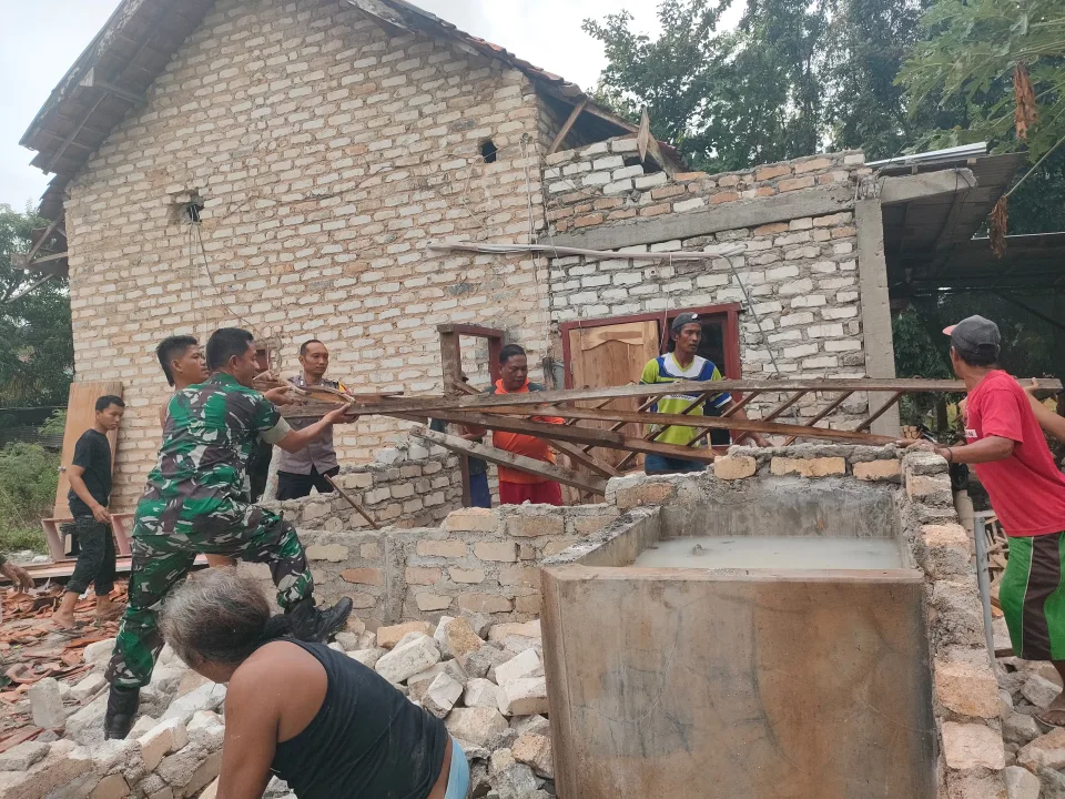 Babinsa Desa Murtajih Koramil 0826-06 Pademawu Pelda Achmad Gufron, melibatkan aparat desa dan warga setempat gotong royong mengevakuasi pusing pusing bangunan dapur milik Alfan warga binaannya, di Dusun Dusun Tegal Saru, Desa Murtajih, Kecamatan Pademawu, Selasa (21/10/2025).