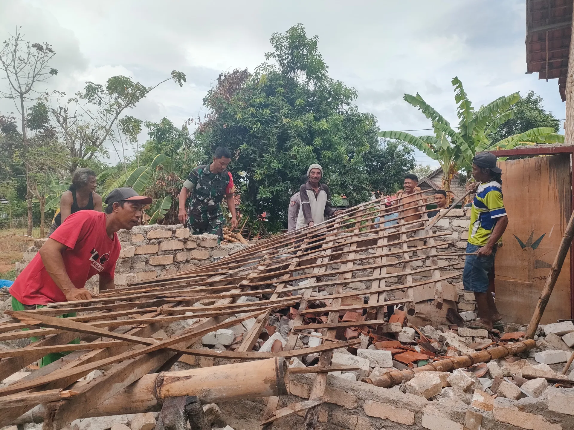 Babinsa Desa Murtajih Koramil 0826-06 Pademawu Pelda Achmad Gufron, melibatkan aparat desa dan warga setempat gotong royong mengevakuasi pusing pusing bangunan dapur milik Alfan warga binaannya, di Dusun Dusun Tegal Saru, Desa Murtajih, Kecamatan Pademawu, Selasa (21/10/2025).