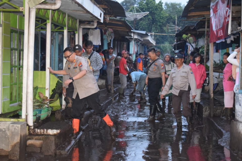 Kapolres Erick juga mendatangi beberapa rumah warga dan fasilitas umum yang jebol akibat banjir yang membawa lumpur itu.