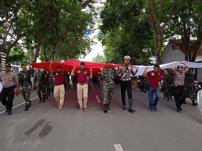 Ribuan warga berbagai dari lapisan dan organisasi kemasyarakatan yang terlibat membentangkan Merah Putih sepanjang 500. Kain merah putih yang lebar 12 meter mulai bergerak dari Taman Makam Pahlawan menuju Lapangan Wijaya Kusuma Kota Sampang. Sabtu, (8/2/2020)