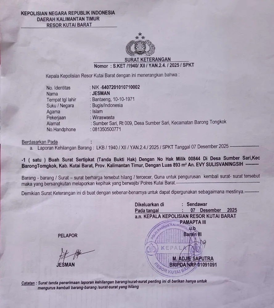 Bagi masyarakat yang mememukan sertifikat tersebut diatas, bisa menghubungi Jesman atau Kantor Kepolisian terdekat di seluruh Kabupaten Kutai Barat.