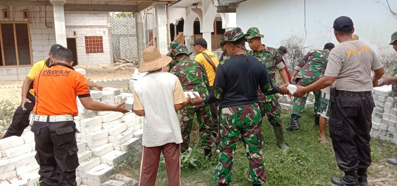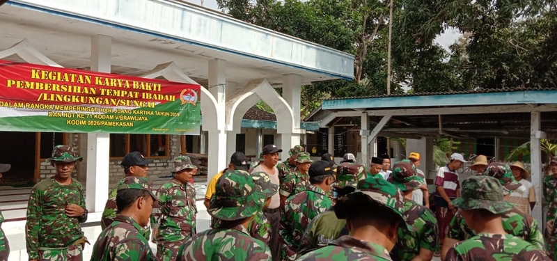 Puluhan anggota Kodim 0826 Pamekasan dengan sejumlah personel Polres melakukan karya bhakti di Masjid As- Syuhada, di Dusun Mondung Selatan, Desa Bunder, Kecamatan Pademawu. Kamis (05/12/2019).