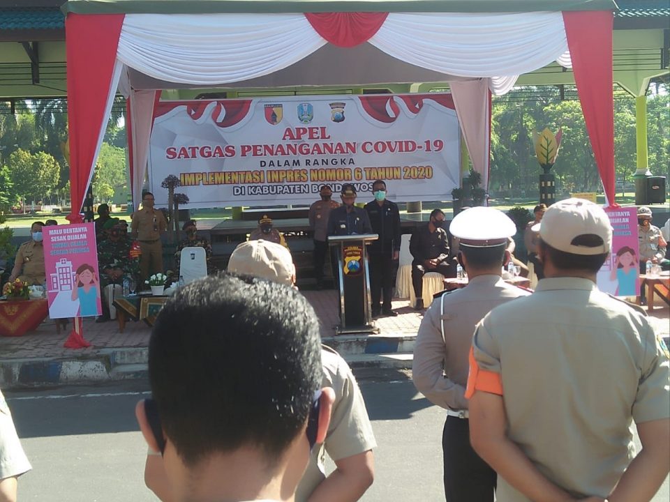Bupati Bondowoso Drs Sawla Arifin memimpin apel bersama para penegak hukum pendisiplinan protokol kesehatan di Alun-alun Bondowoso, Senin (24/8/2020).
