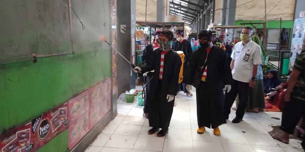 Satuan Tugas (Satgas) Penanggulangan covid-19 Dinas Koperasi Perindustrian dan Perdagangan (Diskoperindag) Kabupaten Bondowoso, terus berupaya melakukan pencegahan penularan corona dengan melakukan penyemprotan disinfektan di pasar induk
