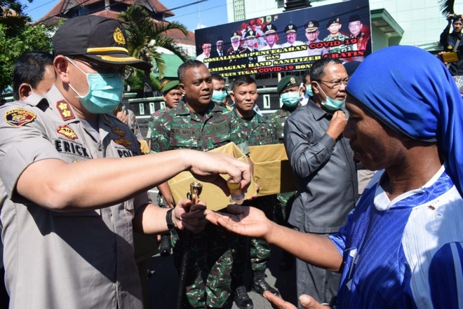 Gugus tugas pencegahan Covid-19 Kabupaten Bondowoso membagikan hand sanitizer gratis pada warga, Senin (23/3/2020).