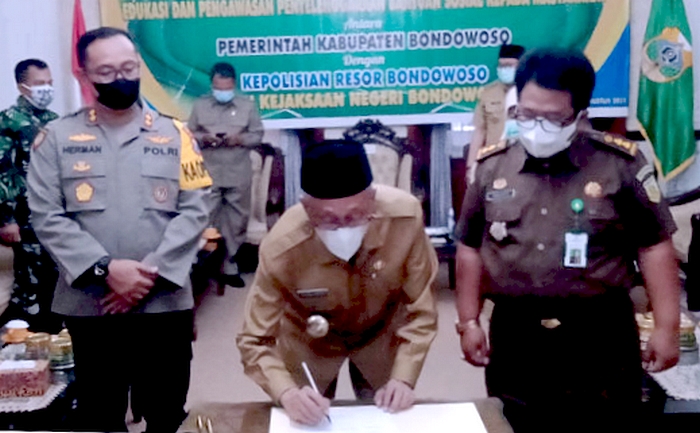 Komitmen bersama tersebut diawali penandatanganan nota kesepahaman (MoU) pemkab dengan Polres dan Kejaksaan Negeri (Kejari) Bondowoso pendapa bupati setempat, Senin 23 Agustus 2021. Nota kesepahaman ditandatangani Bupati Salwa Arifin, Kapolres AKBP Herman Priyanto, dan Kasi Intel Kejari Sucipto.