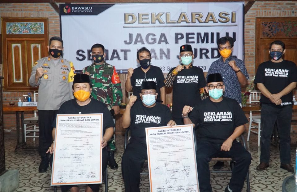 Deklarasi Jaga Pemilu Sehat, Jujur dan Adil Pemilihan Walikota dan Wakil Walikota Blitar dalam rangka Pilkada Serentak Tahun 2020 di Djoglo Djatimalang Jl. Ir Soekarno Kelurahan Sentul Kecamatan Kepanjen Kidul Kota Blitar, Rabu (23/09/2020).