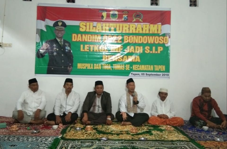 Bertempat di Pendopo Kecamatan Tapen Kabupaten Bondowoso, Dandim 0822 Bondowoso Letkol Inf Jadi, S.I.P., bersama Perwira Staf dan Danramil 0822/11 Tapen Kapten Caj Anas Nahrawi, bersilaturahmi dengan tokoh Agama, Babinkamtibmas dan Muspika setempat. Kamis (05/9/2019) malam.