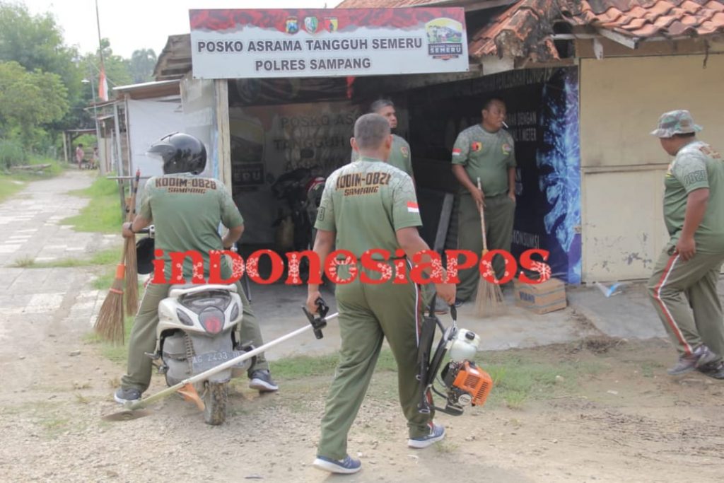TNI-Polri Kabupaten Sampang terlihat kompak saat melakukan kegiatan bersih bersih dilingkungan Asrama Polres Sampang. Selasa (24/11/2020).