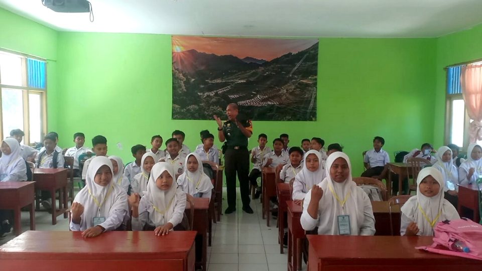 Anggota TNI dari Koramil Waru Pemekasan memberikan pemahaman wawasan kebangsaan (Wasbang) kepada siswa-siswi SMPN 1 Waru, Senin, (17/7/2023).