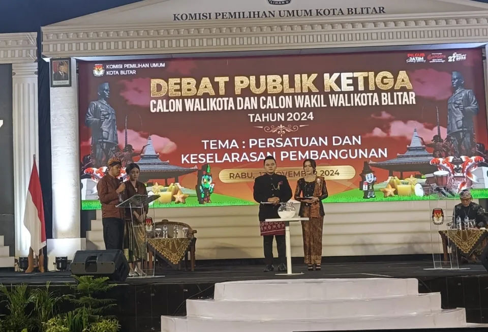 Pasangan calon Wali Kota dan Wakil Wali Kota Blitar nomor urut 02, Syauqul Muhibbin (Mas Ibin) dan Elim Tyu Samba (Mbak Elim), kembali memaparkan visi dan misi mereka dalam debat ke Tiga Pilkada Kota Blitar yang diselenggarakan oleh Komisi Pemilihan Umum (KPU) Kota Blitar di Gedung Kesenian jalan kenari Kota Blitar, Rabu (13/11/2024) malam.