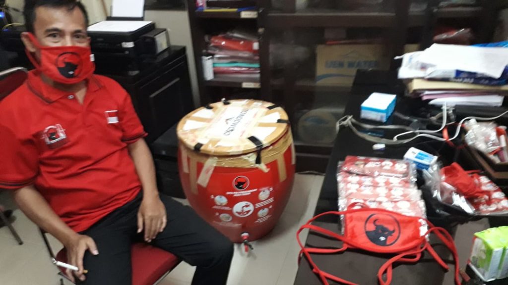 DPD PDIP Jawa Timur (Jatim) mulai distribusikan masker kain dan gentong air tempat cuci tangan buatan sendiri ke sejumlah DPC PDI Perjuangan kabupaten dan Kota. salah satunya DPC PDI Perjuangan Kabupaten Bondowoso.