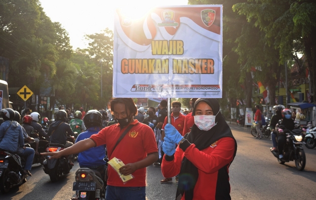 Bondowoso, IndonesiaPos – Polres Bondowoso kembali membagikan masker pada pengguna jalan yang melintasi Alun-alun Ki Bagus Asra.