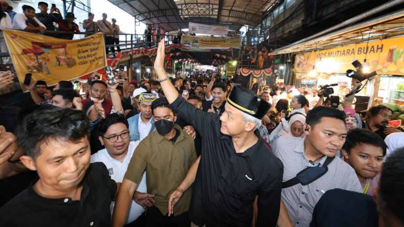 Melihat kedatangan Ganjar, warga dan pedagang tumpah ruwah memadati jalan masuk dan gang-gang kios pasar.