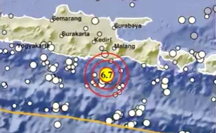 Gempa magnitudo berkekuatan 6,7 SR yang menurut BMKG berasal dari titik gempa koordinat 8,95 LS – 112,48 BT sekitar Barat Daya Kabupaten Malang Jatim dengan kedalaman sekitar 25 km, ini dirasakan hampir semua wilayah Jatim.