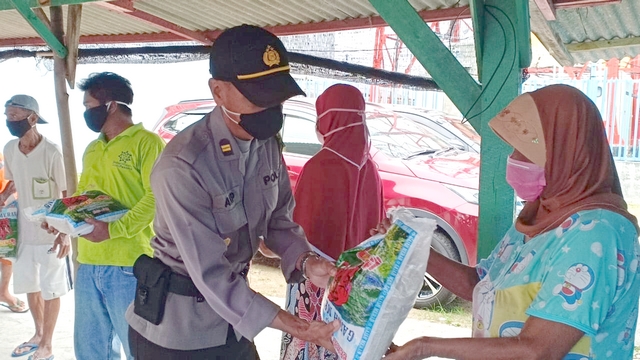 Wakapolres Tanjungpinang Kompol Agung Gima Sunarya, turun langsung menyalurkan beras tersebut kepada warga didampingi Kapolsek Tanjungpinang Barat AKP Indra Jaya dan sejumlah Personel.