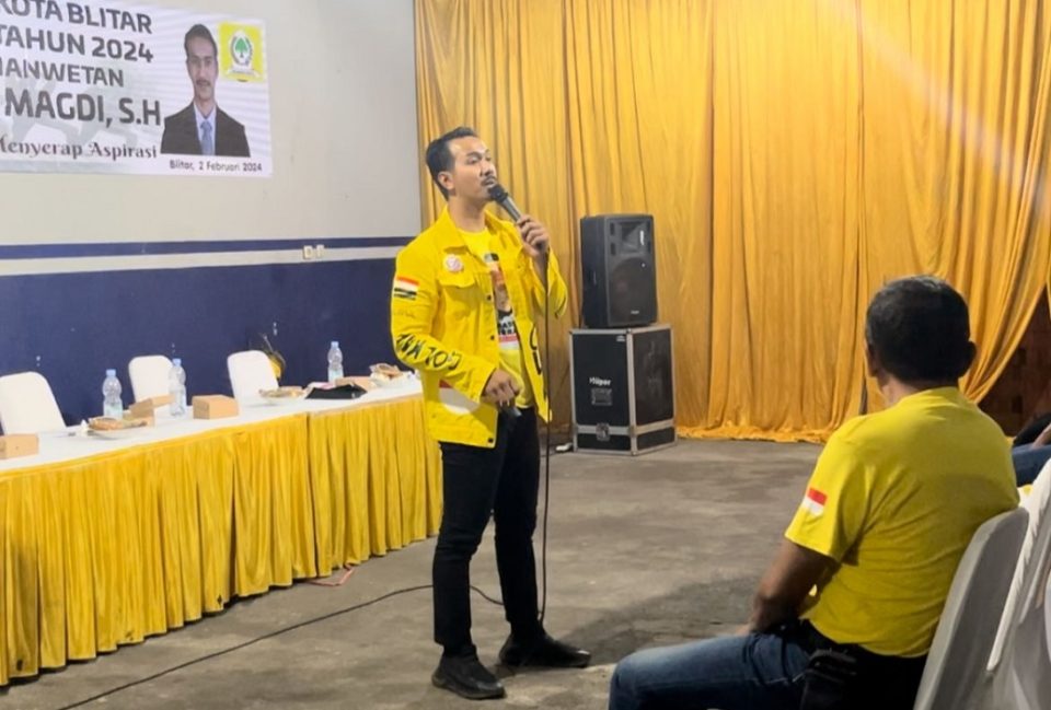 Anggota DPRD Kota Blitar dari Partai Golongan Karya (Golkar), M. Hardita Magdi bertemu konstituennya di toko Sumber Jaya Oli jalan Kenari kelurahan Karang Tengah kecamatan Sananwetan kota Blitar, Jum’at (2/2/2024) malam