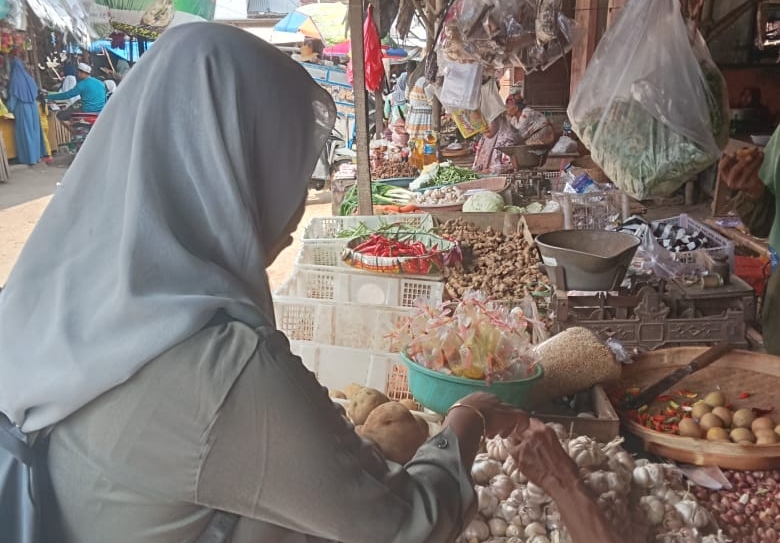 Saat berbelanja ke pasar tradisional Pasar 17 Agustus mengeluhkan lonjakan harga bawang merah dan bawang putih hari ini.