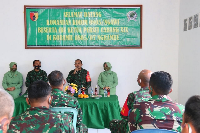 Dalam kunjungan kerjanya, Dandim beserta Ibu Ketua Persit KCK Cabang XIX Kodim Ngawi disambut langsung oleh Danramil 07/Ngrambe Lettu Inf Mulyono dan para anggota beserta Ibu-ibu Persit.