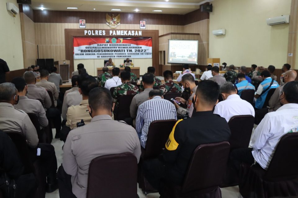 PAMEKASAN, IndonesiaPos – Pelaksanaan Pemilihan Kepala Desa (Pilkades) serentak tinggal menghitung hari. Untuk menjaga Kamtibmas yang aman dan kondisif, Kapolres Pamekasan AKBP Rogib Triyanto, menggelar rapat kordinasi (rakor) Operasi Mantab Praja “ Ronggosukowati -2022, di Gedung Bhayangkara. Kamis (20/4/2024).