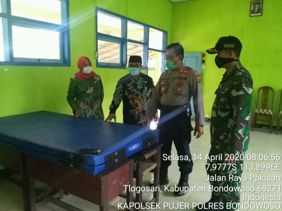 Kepala Dinas Pendidikan dan Kebudayaan Kabupaten Bondowoso Drs H Harimas MSi meninjau tempat karantina covid – 19 di SDN Maskuning Kulon (Maskul) 01. Tempat tersebut disiapkan bagi warga Kecamatan Pujer yang datang mudik dari luar kota.