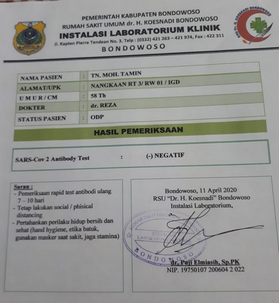 Pada hari Senin, (13/4/ 2020) mendapatkan laporan dari RSUD dr. Koesnadi Bondowoso bahwa pasien atasnama. Diah Tri Agus J, berobat dengan keluhan batuk sehingga pihak rumah sakit juga melakukan Rapid Test kepada pasien tersebut dan hasilnya positif.
