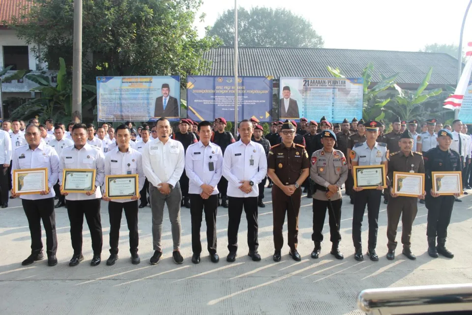 Kepala Kantor Wilayah Ditjen Pemasyarakatan Jawa Timur Kadiyono memimpin upacara apel pagi, di halaman Rumah Tahanan Negara (Rutan) Kelas I Surabaya, sekaligus memberikan penghargaan kepada pegawai berprestasi. Senin (11/8/2025)