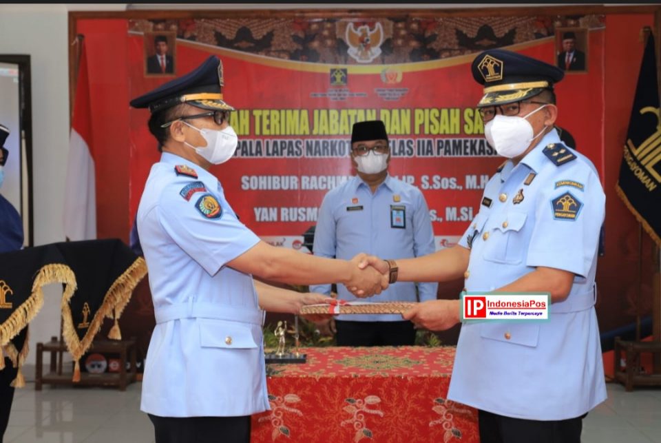 Kalapas Narkotika Kelas IIA Pamekasan Sohibur Rachman disereh terimakan kepada Yan Rusmanto, di Aula Lapas Sustik, Senin, (27/12/2021), pagi, dihadiri Kakanwil Kemenkumham Jatim Krismono.