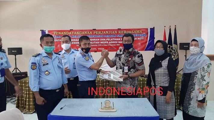 Lapas Klas II A Pamekasan tandatangano Perjanjian Kerjasama dengan SMKN 3 Pamekasan tentang pembinaan kemandirian dan pelatihan pembuatan roti bagi residen rehabilitasi medis adiksi narapidana. Selasa (22/09/2020)