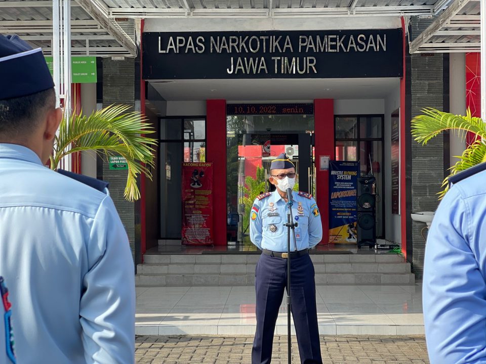 PAMEKASAN, IndonesiaPos – Kepala Lapas Narkotika Kelas IIA Pamekasan Yan Rusmanto memimpin apel dan memberikan arahan, evaluasi kinerja hingga wejangan terkait pelaksanaan tugas dan fungsi, sebagaimana terikat dalam janji kinerja para petugas. di halaman depan Gedung Utama Lapas Narkotika Kelas II A Pamekasan pada Senin (10/10/2022).
