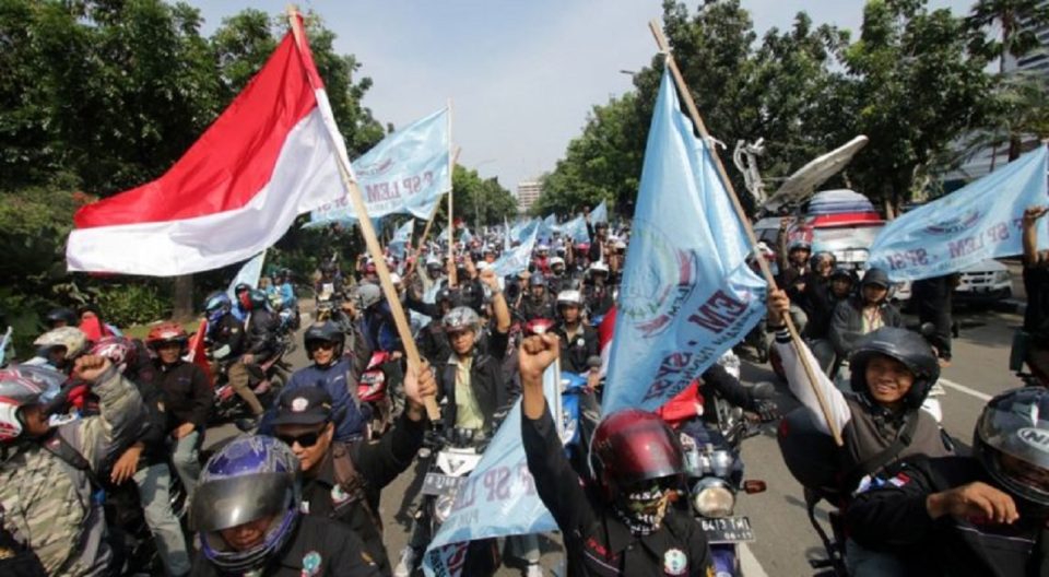 Pantauan di lokasi, buruh tiba pada sekitar pukul 15.11 WIB dengan diawali arak-arakan demonstran yang mengendarai kendaraan roda dua.