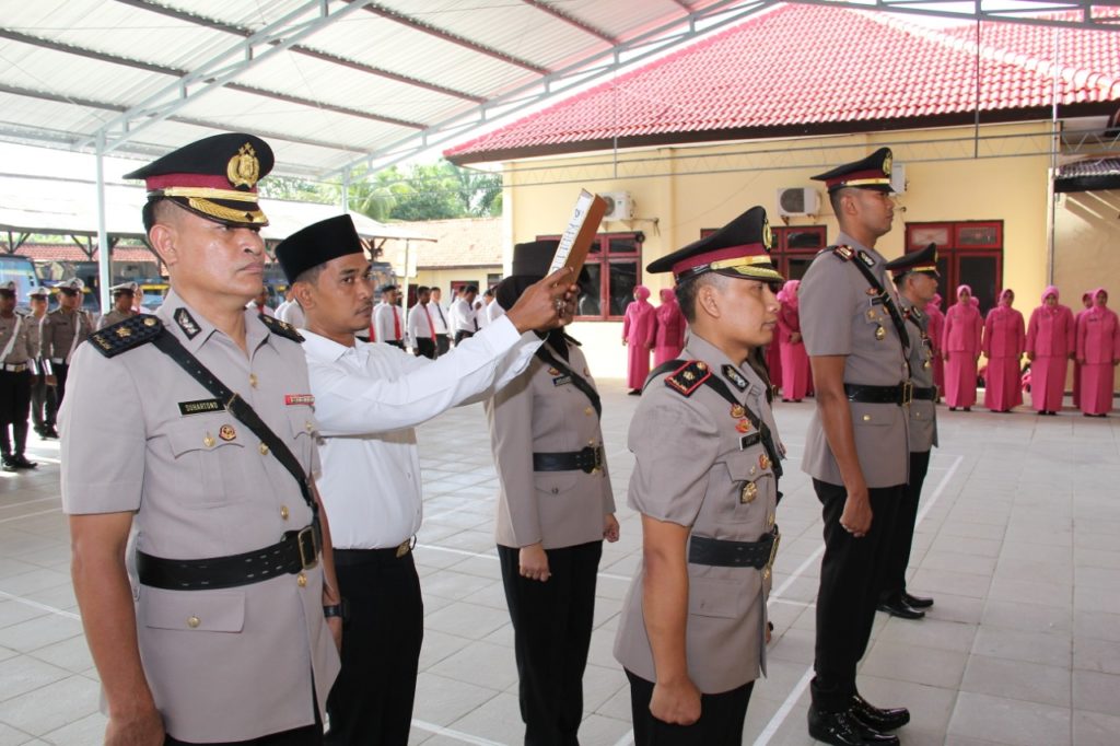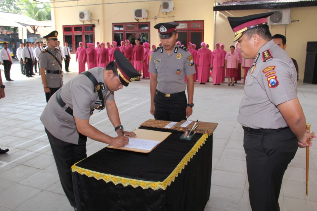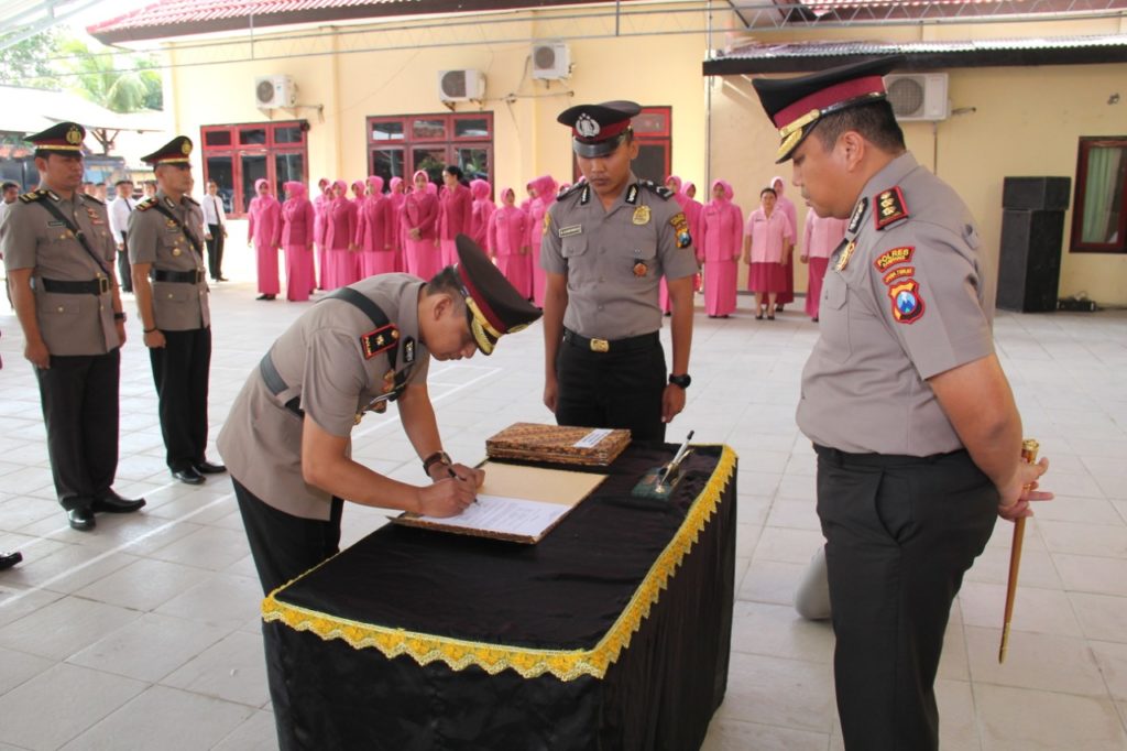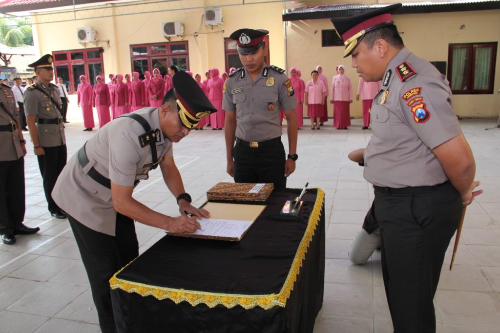 Kapolres Sampang AKBP Didit BWS, S.I.K, MH memimpin upacara Serah Terima Jabatan (Sertijab), Pejabat Utama (PJU) Polres Sampang di halaman belakang Mapolres. Sabtu (11 /1 /2020). Tiga Pejabat Utama yang di ganti yang diantaranya, Waka Polres, Kasat Lantas, Kasatreskrim.