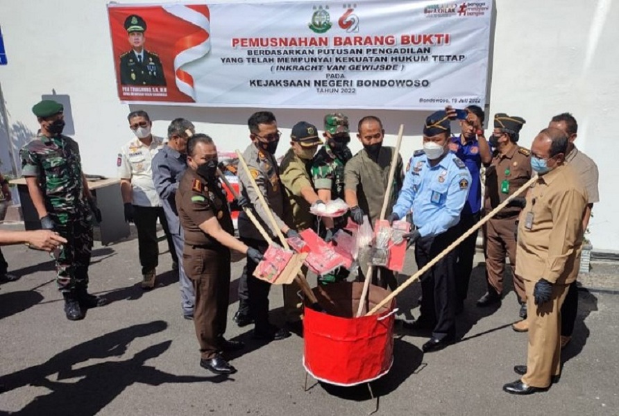 BONDOWOSO, IndonesiaPos – Kapolres Bondowoso AKBP. Wimboko SIK bersama jajarannya, Selasa (19/7/2022) menghadiri pemusnahan barang bukti tindak pidana yang dilakukan oleh Kejaksaan Negeri Bondowoso, selain Kapolres, hadir dalam kesempatan tersebut diantaranya Bupati Bondowoso, Ketua PN, Ketua DPRD, serta Kadinkes Pemkab Bondowoso.