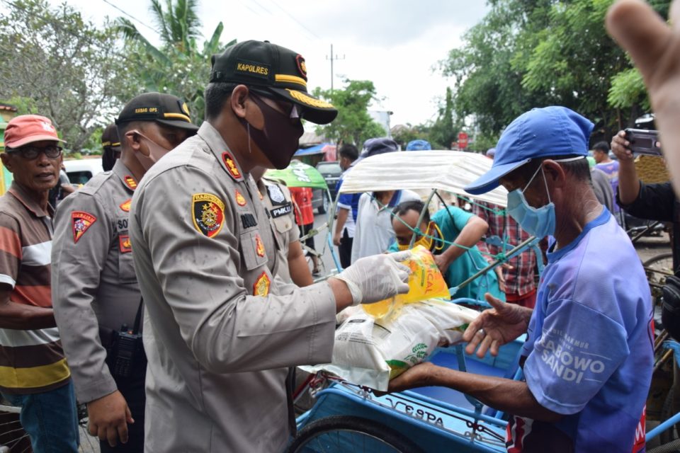 Kapolres Pamekasan AKBP Djoko Lestari, didampingi Wakapolres Kompol Moh. Asrori Khadafi, dan PJU Polres melaksanakan Bhakti Sosial bagikan paket sembako kepada masyarakat seperti Tukang Becak, Pengemudi Ojek Online serta Sopir angkutan Umum disepanjang jalan Stadion, Jalan Kesehatan, Jalan Jokotole, Pasar Kolpajung serta Terminal lama Jalan Stadion
